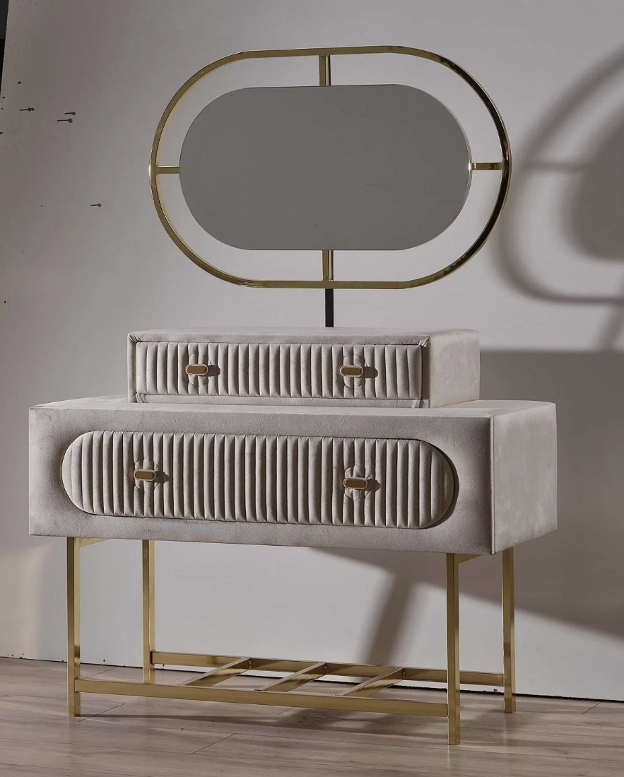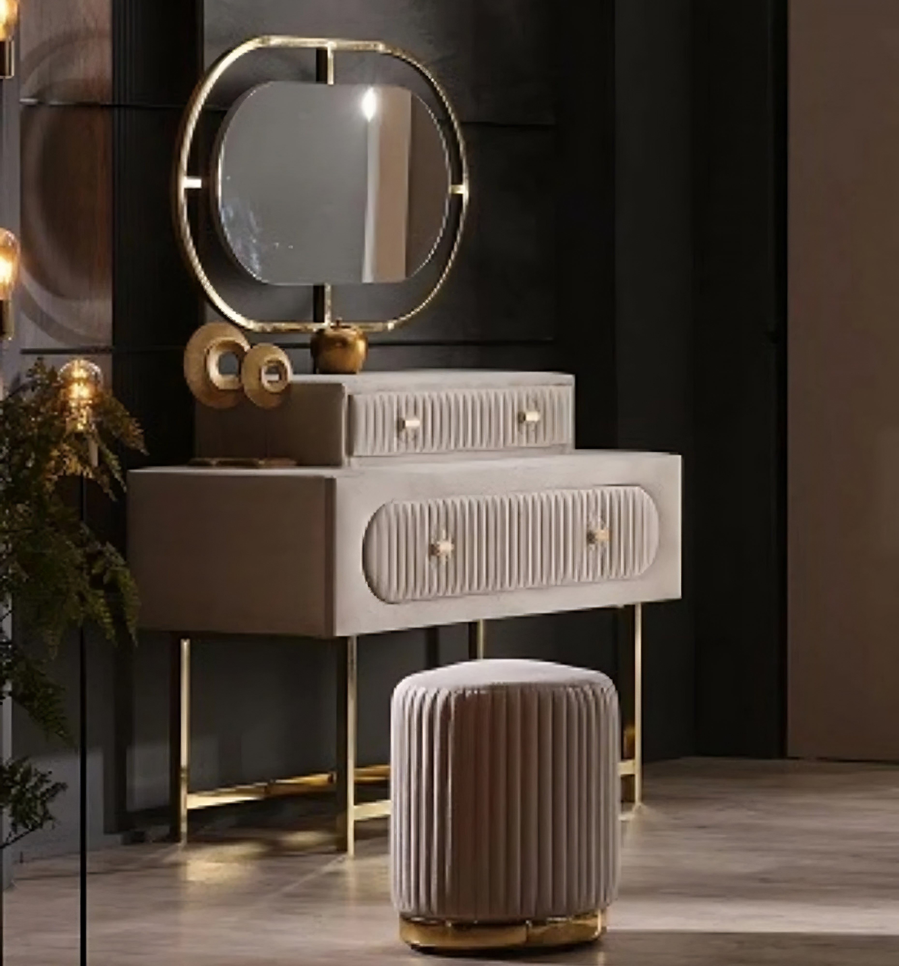 Стилна и функционална тоалетка с огледало, която ще внесе елегантност и изтънченост във всяка спалня. Корпусът е облечен в мека, капитонирана дамаска с изискан релефен дизайн, създаващ усещане за лукс и комфорт.