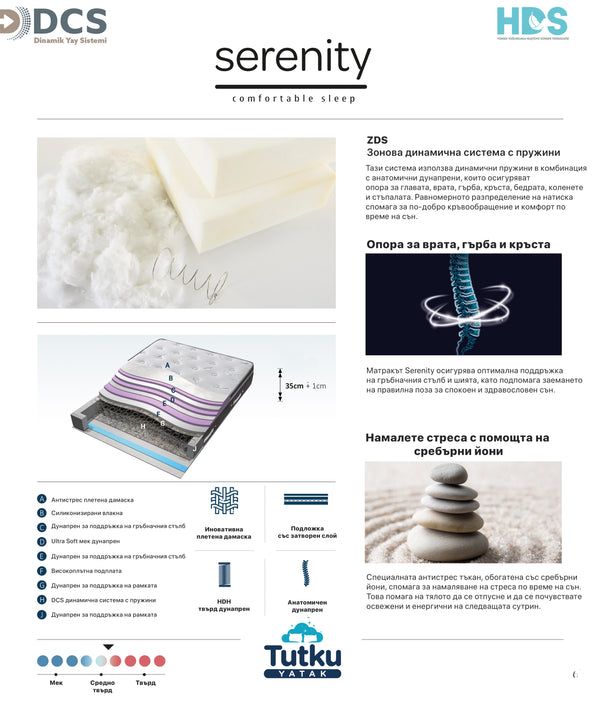 С матрак Serenity ще се наслаждавате на спокоен и здравословен сън всяка нощ, с усещане за мекота, комфорт и спокойствие.