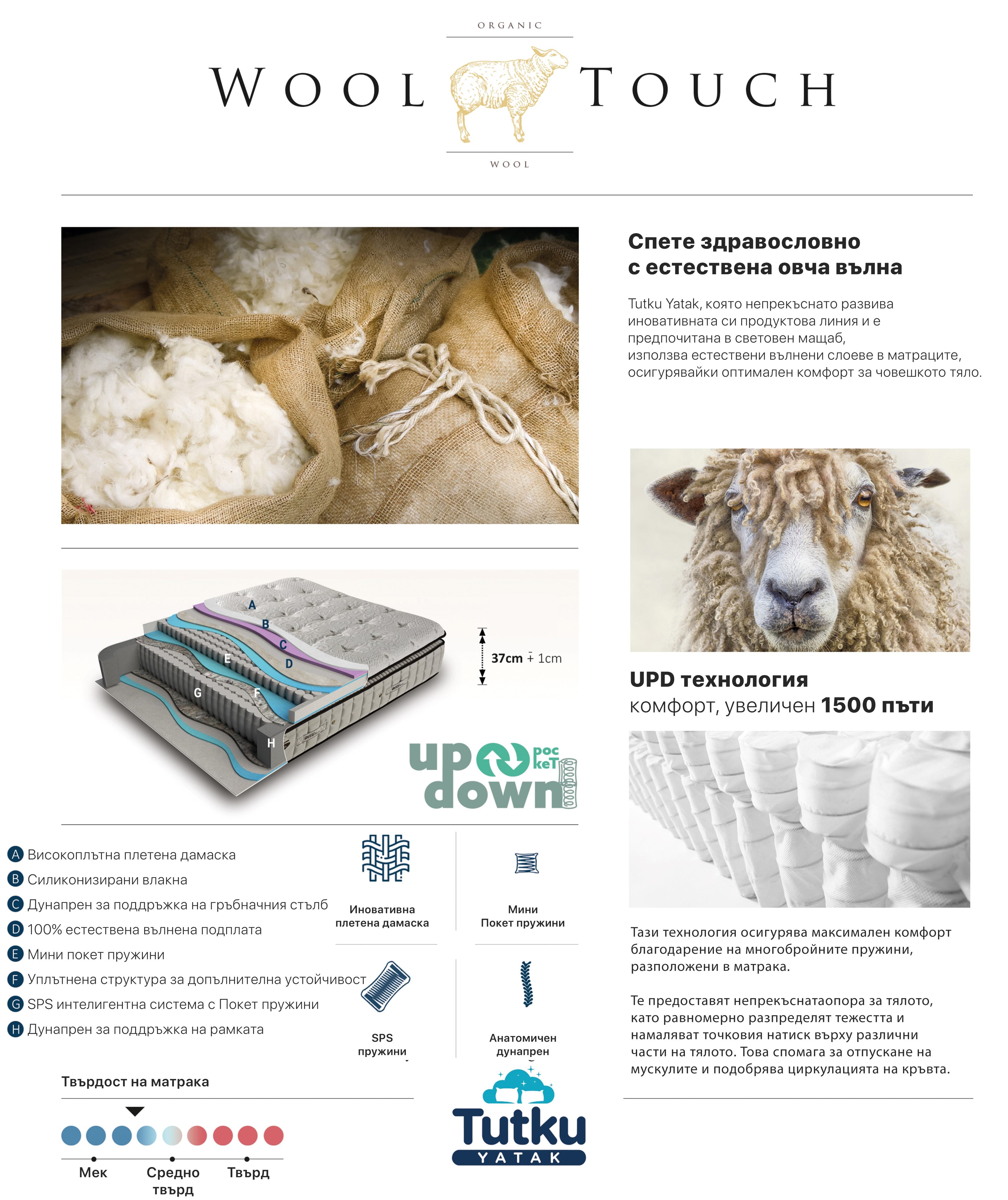Основни характеристики: Високоплътна плетена дамаска – издръжлива и мека на допир. Силиконизирани влакна – осигуряват еластичност и допълнителен комфорт. Слой с дунапрен за поддръжка на гръбначния стълб – спомага за правилното подравняване на тялото по време на сън. 100% естествена вълнена подплата – осигурява топлина и регулира влагата. Мини покет пружини – за равномерно разпределение на тежестта. Уплътнена структура за допълнителна устойчивост – повишава издръжливостта и стабилността на матрака. SPS интелигентна система с Покет пружини – предлага индивидуална поддръжка на различните части на тялото. Слой с дунапрен за допълнителна поддръжка на рамката – за по-голяма стабилност и дълготрайност. Технически характеристики: Височина на матрака: 37 см ± 1 Степен на твърдост: Средно твърд Този матрак е отличен избор за всички, които търсят комфорт, здравословен сън и качествени естествени материали.