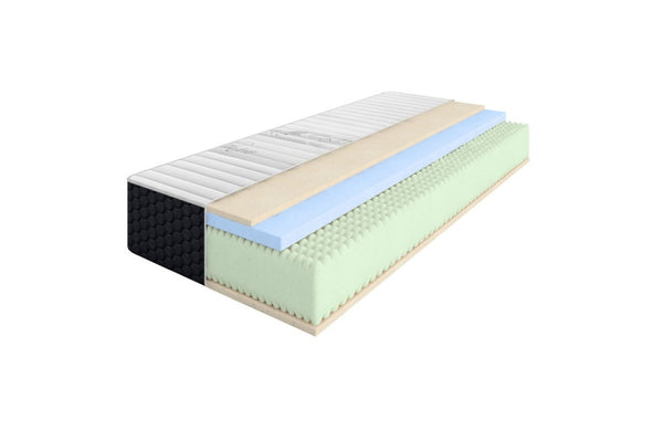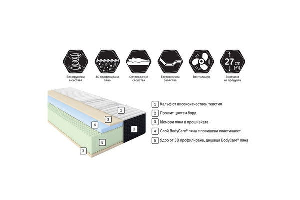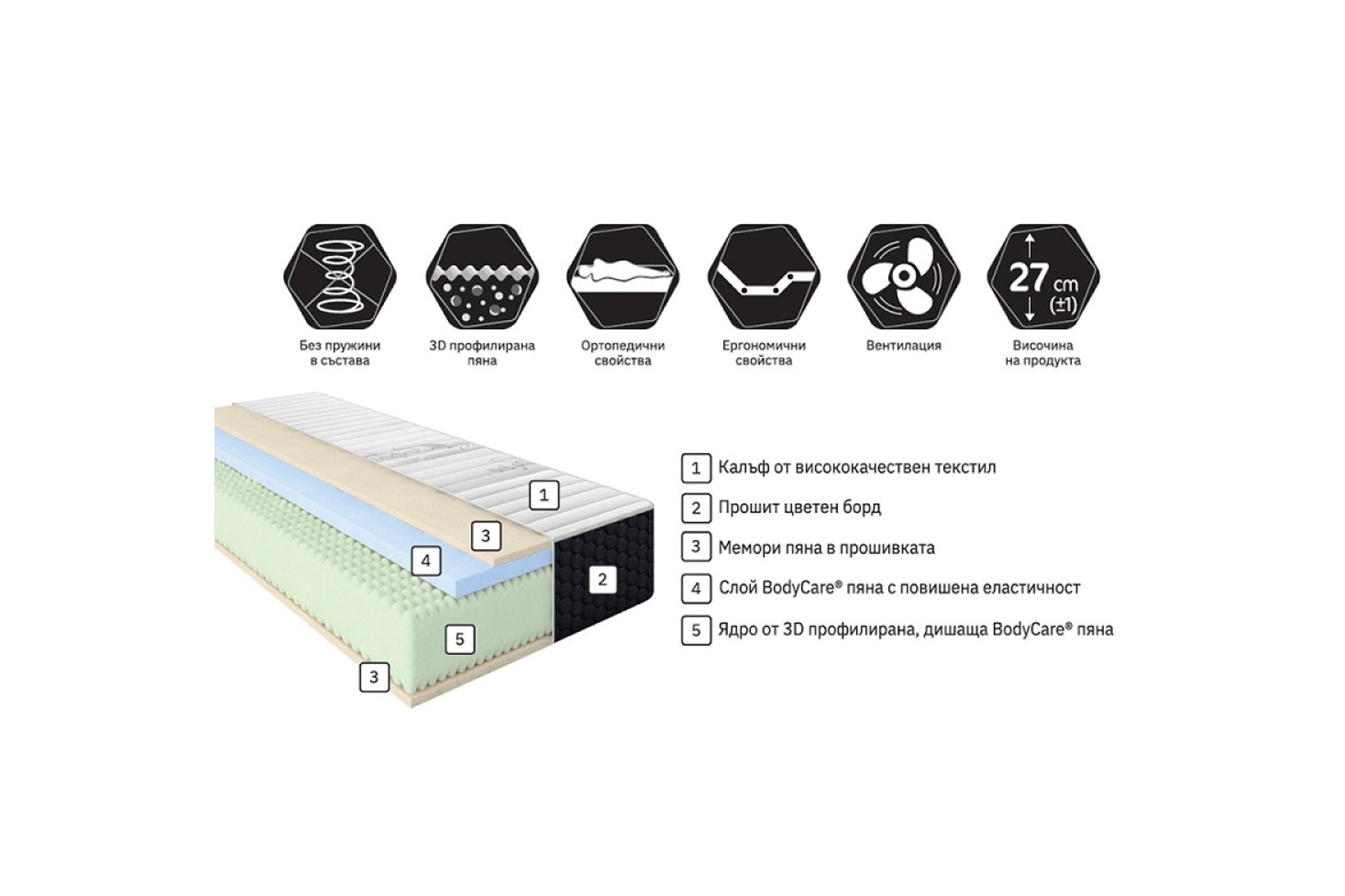 Сърцевината на матрака е изградена от високоеластична пяна, която се адаптира към контурите на тялото и облекчава натиска върху важните точки. Добавените 2 см мемори пяна усилват този ефект, като създават допълнителен слой мекота и комфорт. Средната твърдост на матрака е идеалният баланс, който осигурява както подкрепа, така и уют през цялата нощ.